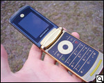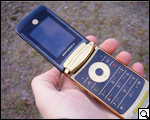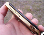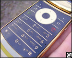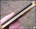 Из всех украшений или дополнений к дизайну экрана под внутренним динамиком мы обнаружили эмблему производителя, выгравированную на позолоченной пластинке. Кстати, о золоте. Полностью золотая окантовка проходит по всей нижней части телефона: клавиатурный блок, внешний динамик и шарнирный механизм – вот где производитель расположил элементы из благородного металла. Золотое покрытие получила также гравировка джойстика, издали напоминающая большую монетку, а также боковые клавиши управления.